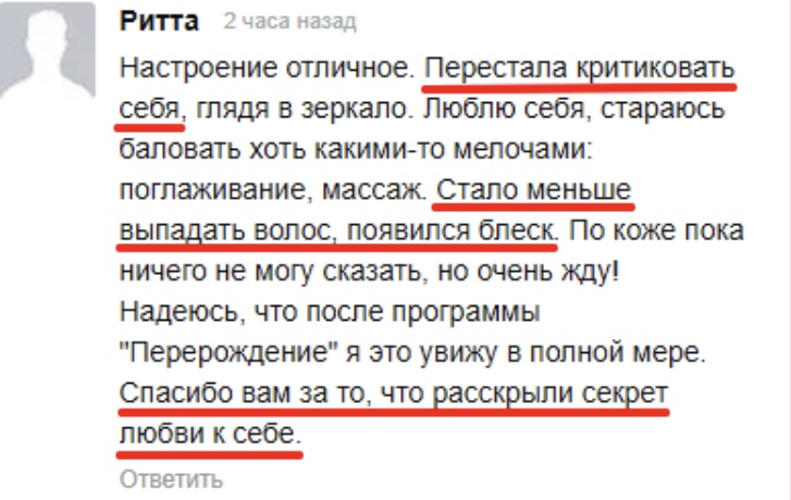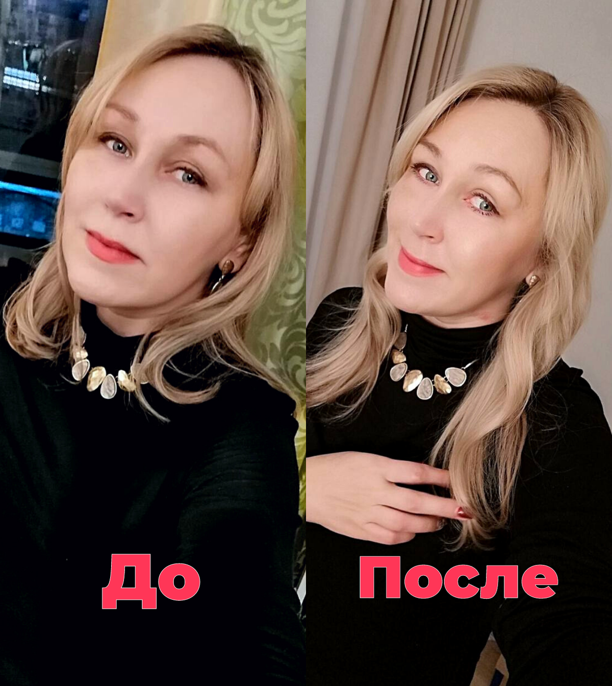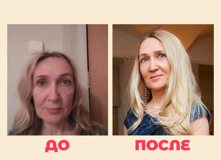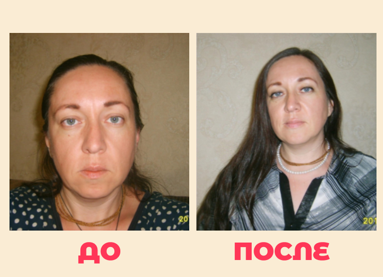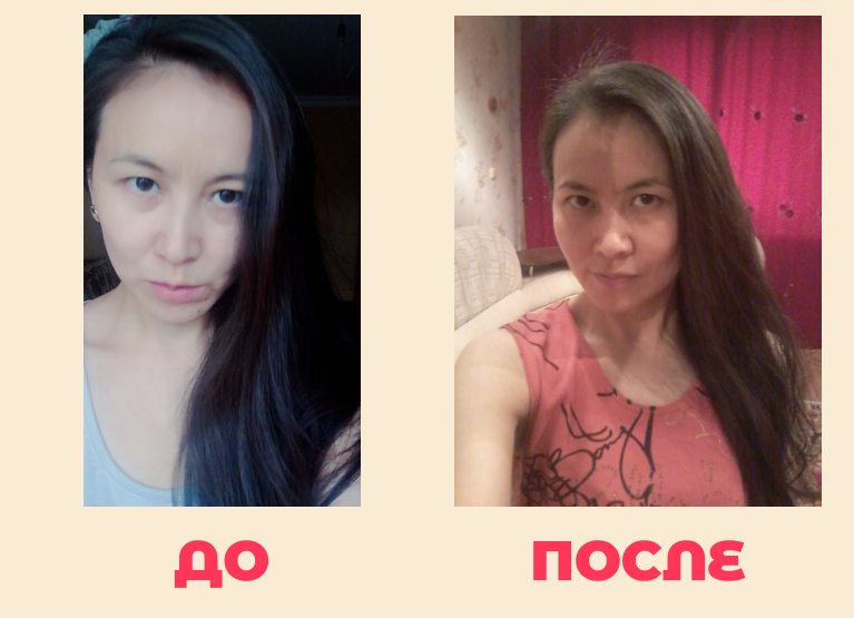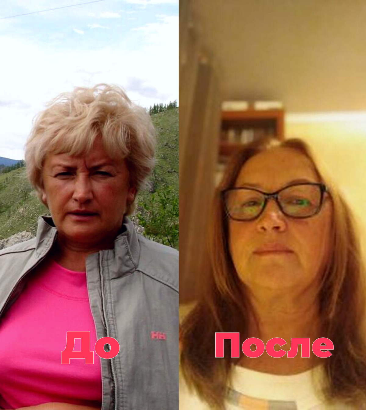 Занимаюсь ещё только два месяца, но эффект ощутила огромный: улучшилась кожа, ушли некоторые морщинки, перестала неправильно мыть, сушить и расчесывать Волосы, как это делала 44 года. Они потихоньку оживают.