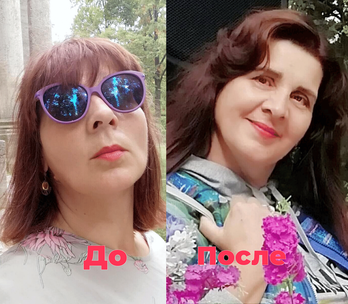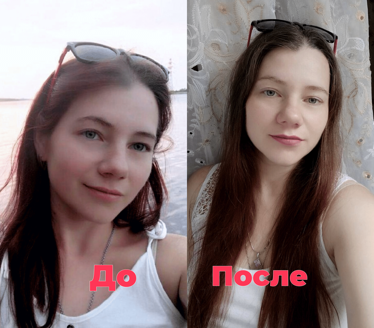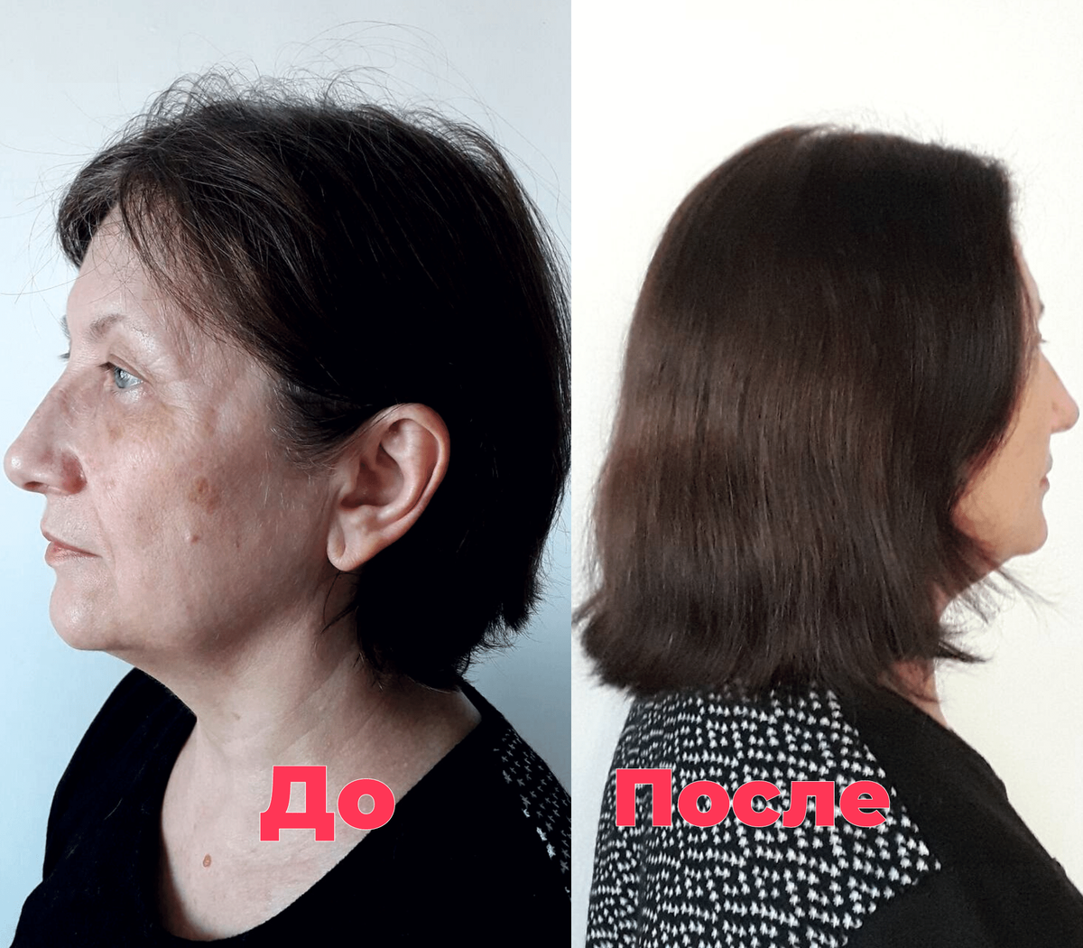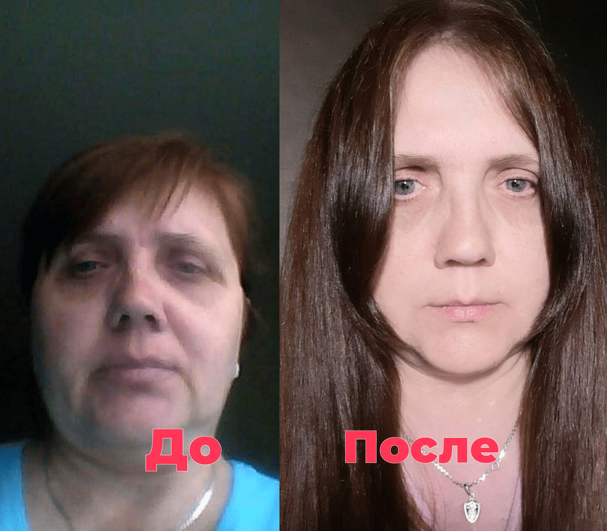 Мои внешние изменения, может быть для других небольшие, для меня очень заметны. Длина волос не изменилась, так мне пришлось их подстригать (были наращены). Волосы ожили, оттенок изменился (окраска та же, пока), залысины в височных областях заросли, кожа стала лучше. За всё это, большая благодарность Екатерине. Жажду познания её новых научных разработок.