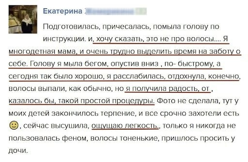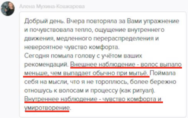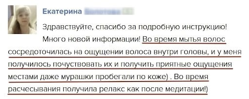 Полученные знания на марафоне у Екатерины, удивили меня тогда своим отличием от общепринятых представлений и отношения к волосам и одновременно заинтересовали меня. За всем чувствовалась фундаментальная методика. Страх, что это развод, признаюсь честно, внутри меня был, но было видно насколько близко к сердцу принимает Екатерина все реакции участников марафона. И я решилась попробовать, записалась на курс и вскоре поняла, что мне необходимо больше - ВИП курс. Весь мой организм жаждет Катиных упражнений и методик. Я схватилась за них, “как утопающий за соломинку”.