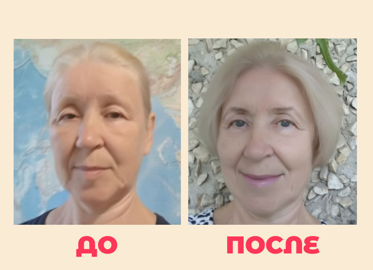 В 65 лет кожа стала более плотной, улучшилось дыхание и работа почек, ушли мешки под глазами.